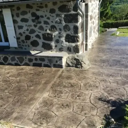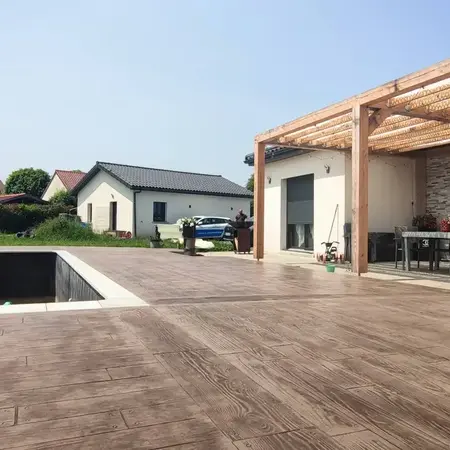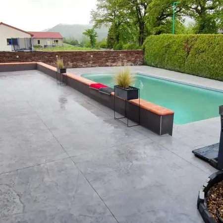 Confiez vos extérieurs à Cantal Béton Déco, Basés à Aurillac, nous intervenons sur tout le Cantal et les alentours selon votre projet. Nous créons des terrasses, allées, plages de piscine et cours extérieures au look pierre, bois ou pavés, avec la solidité du béton et un entretien très simple. Nous travaillons avec les solutions de béton décoratif CHRYSO®, une référence sur le marché, pour vous garantir un ouvrage durable, esthétique et confortable. |
